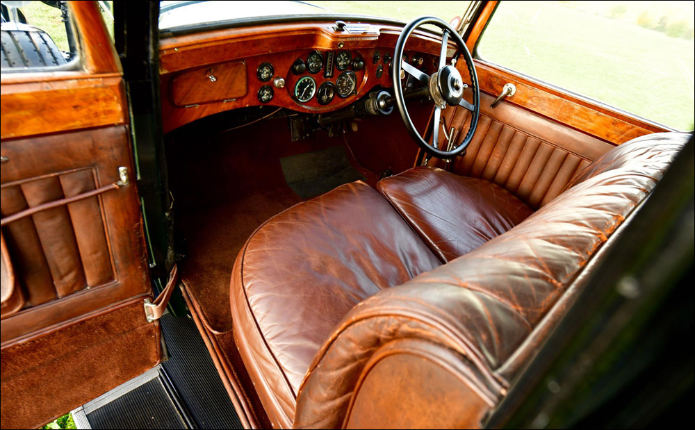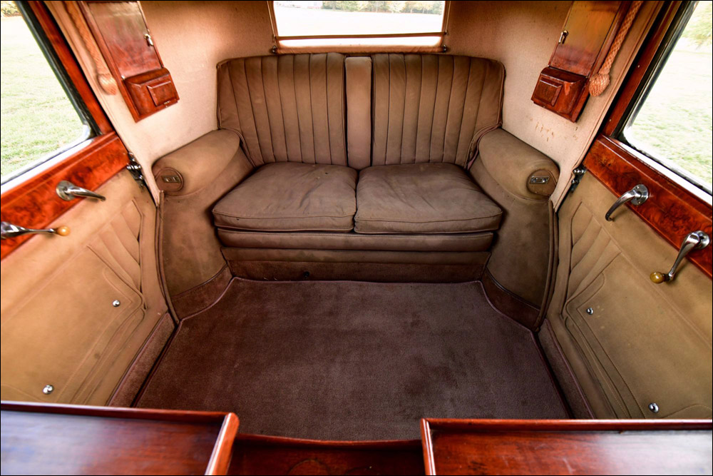 The exterior of the car is finished in Green over black with the paintwork being in very fine order all round. To the interior the car is a benchmark as to how these cars were when new. The front is upholstered in its original brown leather to the seats & door cards along with brown carpets. All woodwork is original with the finish as when it left Mulliners works. To the rear is patinated west of England cloth again in utterly original preserved condition. Twin occasional seats fold out of the bulkhead making the car a true 7 seater. The occasional seats being hidden from sunlight give an idea of the fabrics original colour when new. A wind up/down division is installed in the bulkhead.