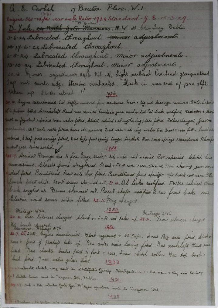 By the time he ordered 537 David Yule had already led a very full life – born in 1895 in Germany during his formative years he lived with his family in North Gate, Regent’s Park and returned to Cologne shortly before WWI as a student. After only a short time in Cologne due to the outbreak of hostilities David Yule was arrested & interned at Ruhleben for the duration; the Ruhleben Register gives David Yule’s address as 24 North Gate – a magnificent serviced mansion block built circa 1907 & requisitioned during WWII for use by the Government. It would seem that David Yule was a scion of the Yules of Scotland & India who had business interests in the Jute, Finance, Shipping & petroleum industries. When David Yule took delivery of Chassis 537 the original chassis cards show 3 addresses – 17 Brunton Place in the name of Carlish (possibly his mother’s family), 24 North Gate Mansions (the Yule family home) and also 25 Eden Quay in Dublin (a business address). David Yule relocated to Dublin in the early 1920s & whilst in Ireland he made quite a name for himself in motor racing circles with his CMY (Cox, Morris, Yule) Morris Eight Special with speeds registered at 96mph - this was in the mid1930s. There was a rumour that David used 537 in the inaugural Irish Grand Prix at Phoenix Park in 1929 but this has yet to be proved! Perhaps someone out there has some old photos or brochures that can help to solve the mystery. Around 1950, after many discussions with David Yule, 537 was acquired by the current family, and remained with them until the present day. |