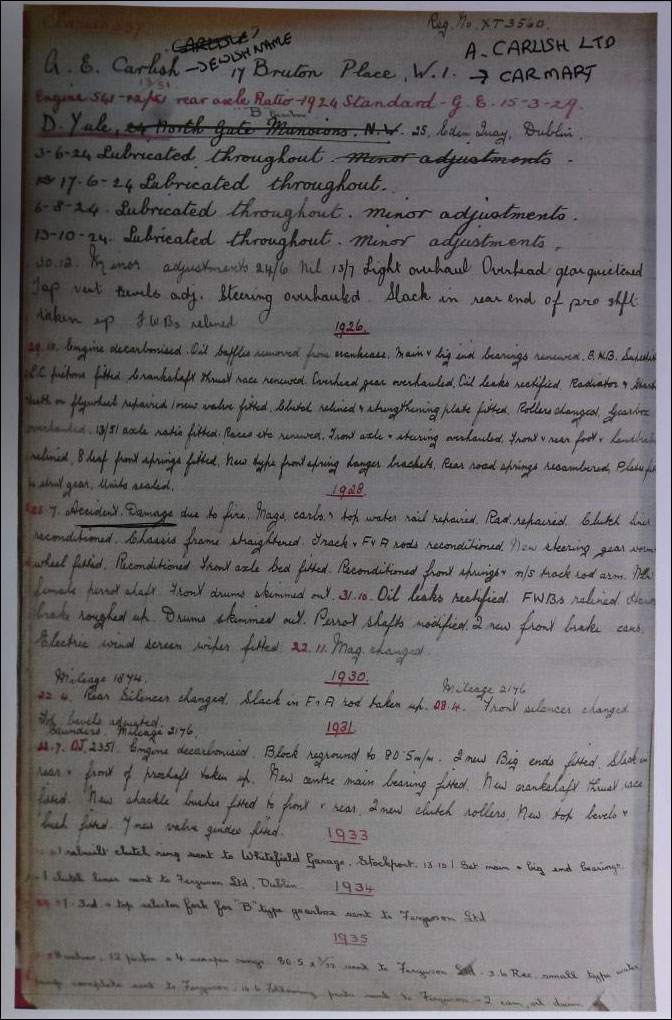 It would seem that David Yule was a scion of the Yules of Scotland & India who had business interests in the Jute, Finance, Shipping & petroleum industries. When David Yule took delivery of Chassis 537 the original chassis cards show 3 addresses – 17 Brunton Place in the name of Carlish (possibly his mother’s family), 24 North Gate Mansions (the Yule family home) and also 25 Eden Quay in Dublin (a business address). David Yule relocated to Dublin in the early 1920s & whilst in Ireland he made quite a name for himself in motor racing circles with his CMY (Cox, Morris, Yule) Morris Eight Special with speeds registered at 96mph - this was in the mid 1930s.