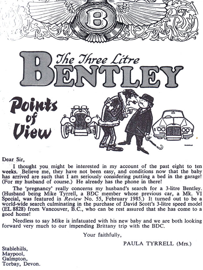 This is an account by Mrs Paula Tyrrell of the weeks prior to the arrival of her husband Michael Tyrrell’s 3-litre Bentley chassis 425 from Vancouver in 1986! “It’s rather like being pregnant really – except that all the symptoms were suffered by my husband!” |