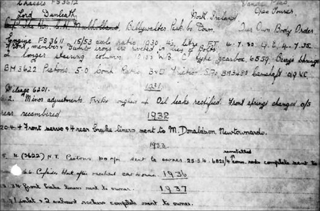 Lord Dunleath took delivery of the car on the 4th of July 1930 and used to drive the car all over Ireland and once a year to Scotland in pursuit of his favorite recreation which was shooting. The Service Record notes various works being carried out until 1938.
