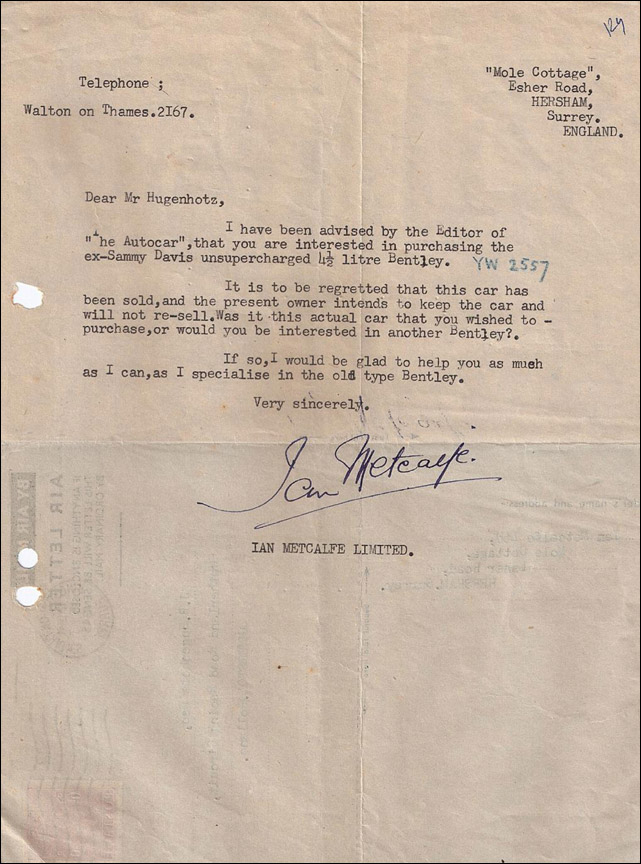 After its second grueling outing at Le Mans, KM3088 was sent to Kensington Moir’s showroom, and sold in the first half of 1930 to Lauchlan Rose. Rose wrote two articles for the Bentley Drivers Club Review detailing his early ownership, which included the fitting of the new “D”-type gearbox in September 1930, along with his change to a glass windscreen. At the end of 1933, Rose passed the 4½-Litre to then-RAF Ground Instructor Lewis Rivers Oldmeadow, a decision Rose regretted immediately. Oldmeadow maintained the Bentley as it was, except for the fitting of a new steering wheel. As he reports in a September 1944 Motor Sport article, the war caused him to sell in 1939, and KM3088 fell out of sight. The last maintenance reported on the Service Report is a new throttle cable, fitted January 1939.